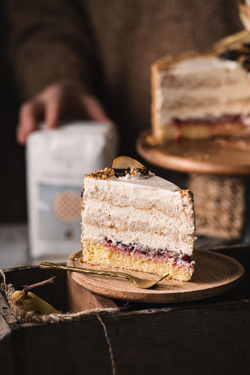 10. Vonjuk be a tortát a maradék krémmel, és díszítsük pörkölt mogyoróval és friss körteszeletekkel.